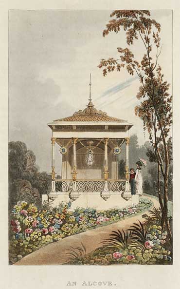 The design of an alcove is represented as seated on an eminence, facing an extensive portion of a garden, and in order to become an ornamental feature from the walks. The stile of this little building is light and elegant, but of no specific architectural character; and from its arrangements and design ought to be rather splendid in its finishing, than otherwise.  The pillars are of iron, and from them are suspended China pattera of rich colours: the chains are gilt, as is also the terminal of the roof. The scale like forms of the roof covering are of thin lead; and may be richly painted; indeed, the whole ought to be so decorated as to become highly ornamental, and be in splendid harmony with its accompanying parterres and flower beds - its aspect ought to be north, to insure shade in the summer, and look forward on the effects of sunshine before it, which would be augmented to the spectator by being viewed from a shaded place - this circumstance ought to be attended to in all buildings of the flower garden, erected for alcoves not meant for the reception of plants; and, in general, where garden seats are erected they ought to be disposed with reference to the seasons of the year; so it is desirable to have a retreat facing the sun for the spring and autumn, and for summer, one that allows plenty of shade and free ventilation. |