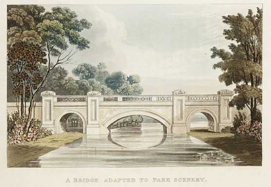 Where water intersects a park in such a way as to render a bridge across it necessary in the line of approach to the mansion, the pictured design would be appropriate, particularly if the ground at each end of the bridge happened to be so elevated, or gently rising from the plane of the park as to permit the parapet to be level, instead of an extended curve, according to the usual practice in such edifices; and this circumstance would allow a greater length to the road-way of the bridge, and consequently produce an effect of magnitude at little additional expense.  Without the side arches, a building so developed would divide the grounds on both banks of the river or canal; but in this instance, a free communication is obtained, and the walks along its margins preserved entire ; which are here supposed to be decorateed by plantations, as being in the immediate vicinity of the pleasure grounds, and one bank may very correctly form a part of them. A bridge of this description ought to be placed so near the mansion as to combine with its general design, and appear to be an essential part of the whole; in which case it wvould greatly add to its seeming magnitude and consequence, and lose its liability to the objection raised to many bridges standing in the middle of a park, on account of their unsupported and solitary appearances. Water DecorationSheets of water however beautiful in form, unless it be the ocean, are little interesting in themselves - they require the intervention of suitable objects of art or nature to decorate them, either on the margins or their surfaces, as the character of the place demands. The wise artist will supply these in order to produce variety and intricacy, without injury to the composition of the landscape, and to its correct breadth of effect, and without overloading the picture, as it is called, by too much material. In the decoration of water, it is necessary to remember that it doubles by reflection all the objects of its margin. This circumstance is favourable, or otherwise, according as the means are adopted ;-if the banks are steep and the water narrow, an ill effect is produced, because the height of the banks is exaggerated, and the width of the water seemingly diminished. If the water is wide, as in lakes, then the steepness of its banks and the over-hanging foliages of its margin acquire added dignity and multiplied effect. The management of the varieties of the margin of ornamental water is of great conse- quence; when it is viewed transversely or over narrow portions of it, the ground should slope to the water's edge, or the banks will intercept the view of its surface and possibly hide it completely; on the other hand, when water is viewed upward in its length, steep and broken banks add the advantages of form and colour to the variety it produces, and give force and vigour to the scene. Water ought to be placed to the southward of the man- sion, not only on account of the coolness of effect, but as its brilliancy is augmented when so viewed. Because nature is not prolific of the nobler trees in the vicinity of much water, she has added to her store such as are peculiarly suited to its decoration; and in the aquatic plants will be found the means of adding still more extensive variety, than at first appears, to the retired scenery of the grounds: these, differing in colour and character, may be so arranged as to be highly ornamental, and favorably contrast the valley with the hill. When the valley is not of adequate extent to allow the introduction of the lake, the river may be much improved by separating its course into branches: so forming small islands or aits; which, when planted according to their forms and characters, will become admirable decorations. |