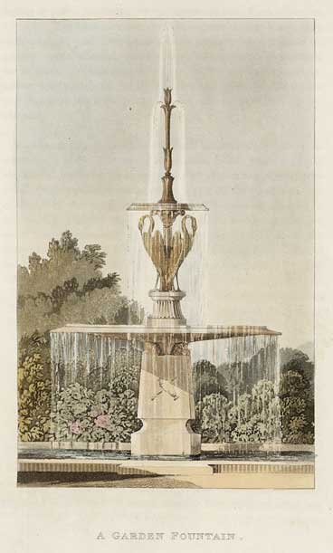 These proportions of conducting pipes are suitable to jets removed from reservoirs not exceeding five hundred feet; but if the water requires to be brought from a yet greater distance the pipes must be of larger diameters. Unless the bends in pipes of communication from the reservoir to the aperture or ajutage be easy and bold, the escape will be proportionally impeded; and to produce an even and regular jet it is necessary to apply a suitable air vessel near to the ajutage, the making of which is well known to manufacturers in copper, of which material they are usually constructed. The decorative designs are simple in form, and consequently limited in show of water; but if the jets were amply supplied, the overflow of the tables would produce the effect desired. Designs of this kind are now usually manufactured in artificial stone, or sculptured in Portland stone; as they were formerly of lead, the convertibility of which valuable metal undoubtedly assisted in the rapid disappearance of fountains as soon as they fell into disrepute. The present rage for cast iron will probably supercede the use of such leaden works, and as iron would offer no premium for their demolition, they may be expected to enjoy a longer triumph of fashionable importance in our gardens. |