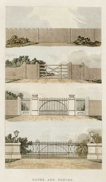 The garden gates and fences in this picture demand early consideration, for, until the property be secured from injury and depredation, it is useless to plant: hence the first suitable moment ought to be taken to secure the plants proposed to accompany the enclosure. This garden screen from offences without, ought to be liberally made, a partial removal for advantages of prospect being rapid and easy; but its deficiencies can only be supplied by a lapse of years, always to be regretted.  The picture represents designs for garden gates and fences, progressively advancing in degree from simple park paling to the decorative wrought iron work suited to villas or mansions. Thus the first design represents an oak close fence gate in two modes of making, that on the right is embrasured by using pales of unequal lengths alternately, that to the left is straight, and is therefore less vulnerable to the injuries which frequently happen when the palings are unsupported by each other, and the strong wooden oak fillet that is usually applied to the tops of this explenty of, firmly uniting them together. The second design is for a field gate of considerable strength and unique form; it is suited to a farm house or other building in that degree of pretension. The hinge side of the gate is strengthened by double posts, according to the dotted lines, and on the right is a hand gate to correspond. The beautiful third explenty of is suited to a villa or manorial house, and is applicable to any country house, where ornamental decoration is sparingly introduced: this is completely constructed of wood. The succeeding and last design is of a higher class, and is proposed for execution in iron. Stone walls, in regular courses, should accompany these gates, at least for a considerable dis- tance, and a small lodge would correctly be placed near them. As the adaptation of boundary fences must very much depend on the materials allowed by the country or neighbourhood of the improvement, so should the gates correspond in design and character; when the materials are wood, then a light form is admissable; but when stone, and possibly in large and solid blocks, are to be used as walling and piers, iron gates or more substantial forms and makings become necessary. Fences in garden situations are improved in characteristic appearance by plenty of clothing allowed to them by ivy, bramble, and such defence from pressure by cattle, as can be supplied by thorns, hornbeam, birch, and alder, according to the suitable nature of the soil - these also assist in partial hidements of the fence, which are essential to a pleasing effect, because, by otherwise showing itself as a mere boundary, the mind of the spectator too readily recognizes limitation and restraint. It is true that oak fences are subject to premature decay, when not exposed to the free approach of air, but on the other hand, these means greatly protect them from wet, the destroying operation of stormy winds, and the injuries permitted by an easy approach to them; and when decayed, they often support the paling as effective garden fences for many years. The painter and the poet, have not failed to gain from the scenic beauty of the ivy capped tower and wall, whether of brick or stone, richly and harmoniously stained by mosses, anmd venerable a prolonged decay, unwillingly yielding to the picturesque devastations of time. When these materials form the boundary wall, every such means towards its decoration ought to be adopted, for surely no appearance can be more ugly than its otherwise dull and prison like monotony, and, if not built with mortar, threatening hourly dilapidation. In counties where piled stones are the ordinary walling, and thence scar and disfigure the face of nature there, much of the deformity may be hideed by the beautiful and legitimate veils with which vegetation could be made to over mantle them. The desire of privacy renders it necessary that small properties ought to be effectually screened from public roads; but when gardens are situated in parks, their boundaries should not be permitted to exclude the advantages that the park scenery is capable of allowing, or give the spectator reason to suppose that the proprietary is subdivided. Parks being in themselves adequate separation, generally, to ensure privacy to the garden, the traveller has reason to expect from the liberal owner that the park fence shall be no more an interruption to his prospect than is adequate to guard the property, confine his stock, and exclude the impertinent intruder: for there is nothing so fatal to the beauty of the road, as the fences and walls that confine his views. Boundary fences, near public roads, are of several descriptions, suited to the size and nature of the property, and constructed according to the object desired, as mere wood paling or park fencing, brick or stone walls upon level ground, or fences or walls raised on banks with a trench outward. A great variety of means may correctly be used in the same estate, adopted or made according to the circumstances of the place, and the peculiar advantages each is capable of allowing. |