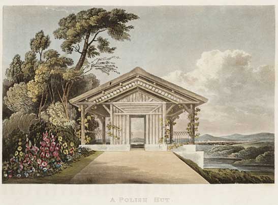 This design is meant as an decoration to plantations, and to form an open and spacious retreat, fancifully intersecting a long and straight pathway of an elevated terrace. Several buildings so placed, and at correct distances, produce an agreeable vista, and are particularly useful and ornamental in newly made plantations. This kind of improvement has been successfully adopted at the beautiful grounds of White Knights, by his Grace the Duke of Marlborough, who, in this way, and by arcades and trellises, has created a unique and interesting feature in a part of his domain, that was otherwise destitute of interest.  The style of this building is similar to many of the cottages of Poland, and not unlike those of Switzerland: the former country, however, allowed the explenty of from which the present design originated. These huts were greatly admired, and possibly first employed in garden decoration by the celebrated architect Kleber, in the picturesque and anglicised grounds of the Marquis of Florimont, at Florimont in Alsace. This is the same Kleber, who, later, as general in the French service, so eminently distinguished himself in Egypt, by his amiable manners, and his scientific and military acquirements; and of whom Buonaparte exclaimed "If I could be jealous of another, it would be of Kleber!" - he was born a general, and bred an architect. The trunks and arms of trees that retain their bark, are the simple materials of which the building is erected, and the roof is covered with reed thatching; the cieling and walls are covered with kiln-dried furze, which is of a warm drab colour, and which, from its nature, is little subject to become a harbour for noxious insects or vermin; indeed, the abundance of these troublesome creatures are so injurious to the use of garden buildings which are not enclosed, that it is desirable to ascertain a remedy efficient to prevent their approach. The furze so dried, is adverse to small animals and birds, and has a reputation for being ugly to insects; but it is doubted if experience warrants full dependence on its efficacy. If, however, seats were detached from the walls, and supported on glazed porcelain feet of a mushroom shape, and used as castors are applied to furni- ture, it would prevent the annoyance, in a great degree, which some people find from these intruders. If straw be used instead of reeds for thatching, a few seasons will show the propriety of employing the sharper material: for mice and sparrows have a great facility of assailing such roofs, and speedily destroy them. |